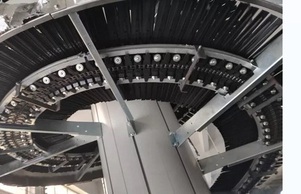 This innovative chain enables a low rolling friction operation without any sliding movements or wear strips on the spiral conveyors.The chain is pulled by a heavy duty steel roller chain and the slats are supported by precision steel roller bearings which ride on a polyurethane surface.This arrangement effectively takes up the side forces created by a tight radius and at the same time increases the load carrying capacity.This enables the spiral conveyors to start and stop fully loaded and facilitates high speed,low noise and long life.